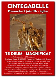 TE DEUM | MAGNIFICAT Dimanche 9 juin 2019 17:00 Église de CINTEGABELLE M.-A.Charpentier | C.Monteverdi Le Te Deum (H. 146) en ré majeur de Marc-Antoine Charpentier est un grand motet versaillais (forme musicale née à la cour de Louis XIV). Il a été composé entre 1688 et 1698, durant le séjour du compositeur à l’église jésuite Saint-Louis, à Paris, où il était…